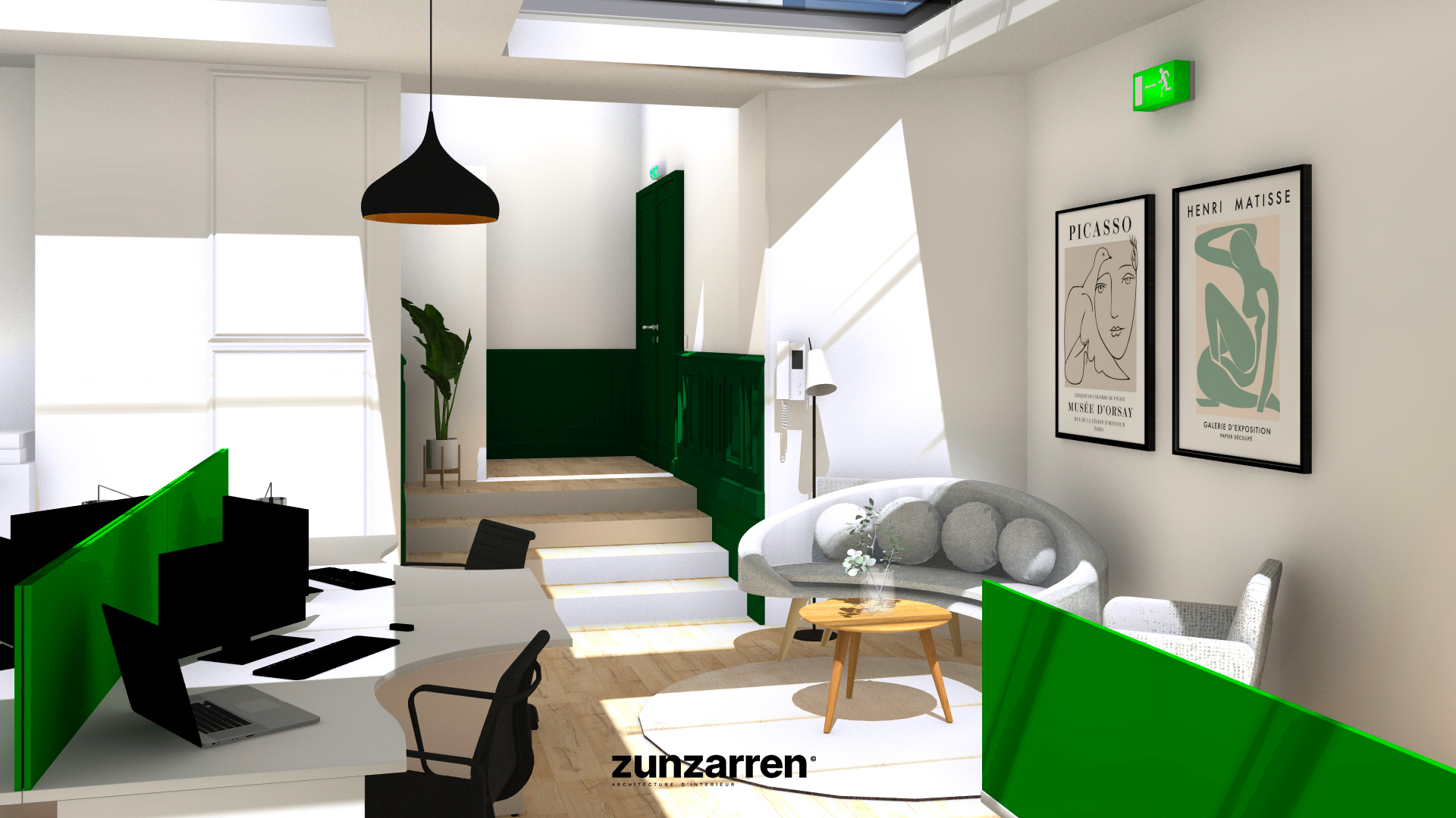 En 2021, j’ai mené une étude de rénovation pour un plateau de 98 m² situé dans un immeuble haussmannien parisien, destiné à accueillir une équipe de 10 collaborateurs.