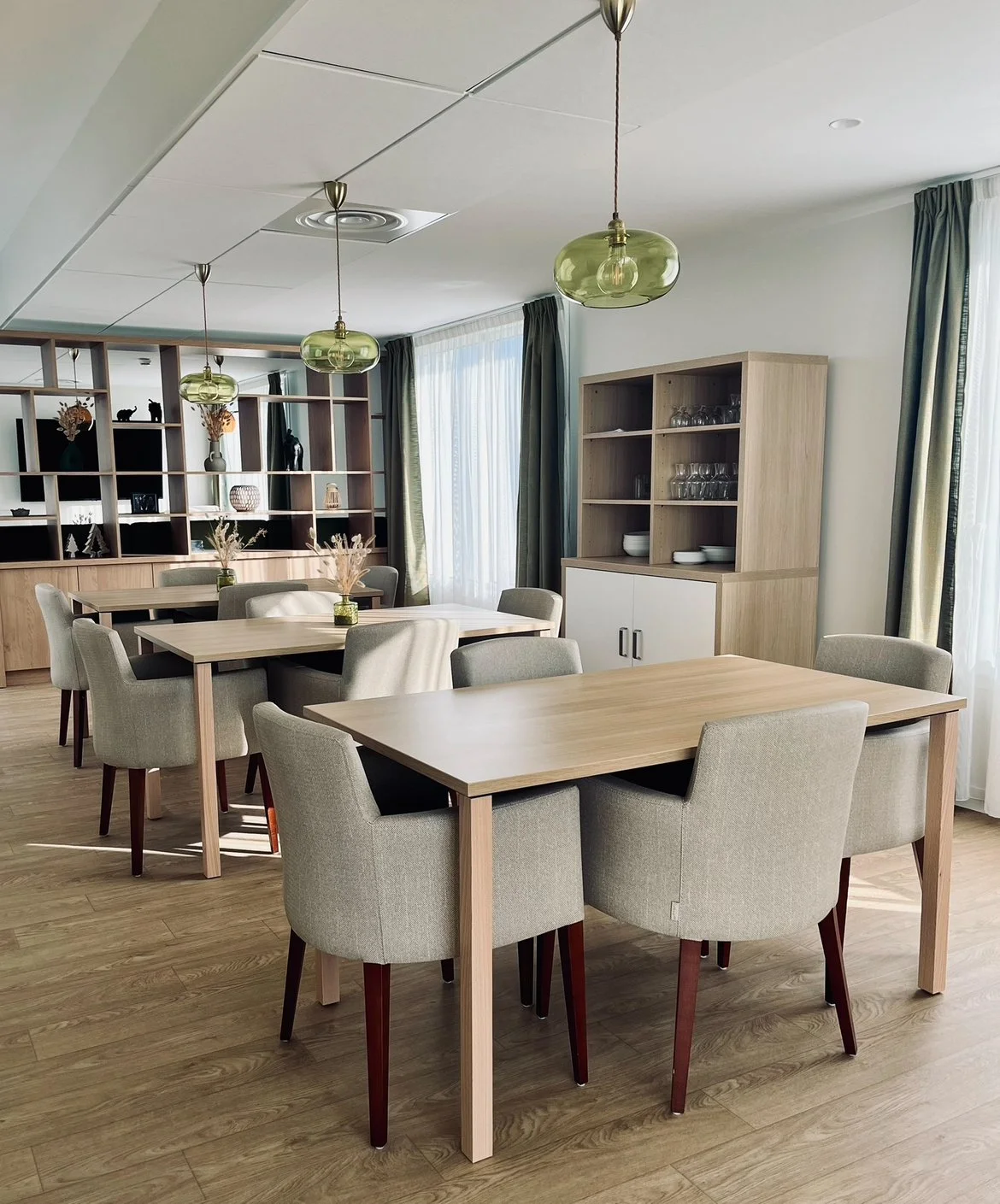 L’architecture intérieure a été conçue dans un esprit de douceur et de clarté, intégrant une palette de matériaux et de couleurs propices au confort sensoriel. Les circulations ont été fluidifiées, les repères visuels renforcés, et les espaces collectifs pensés comme des lieux de rencontres et de partage.