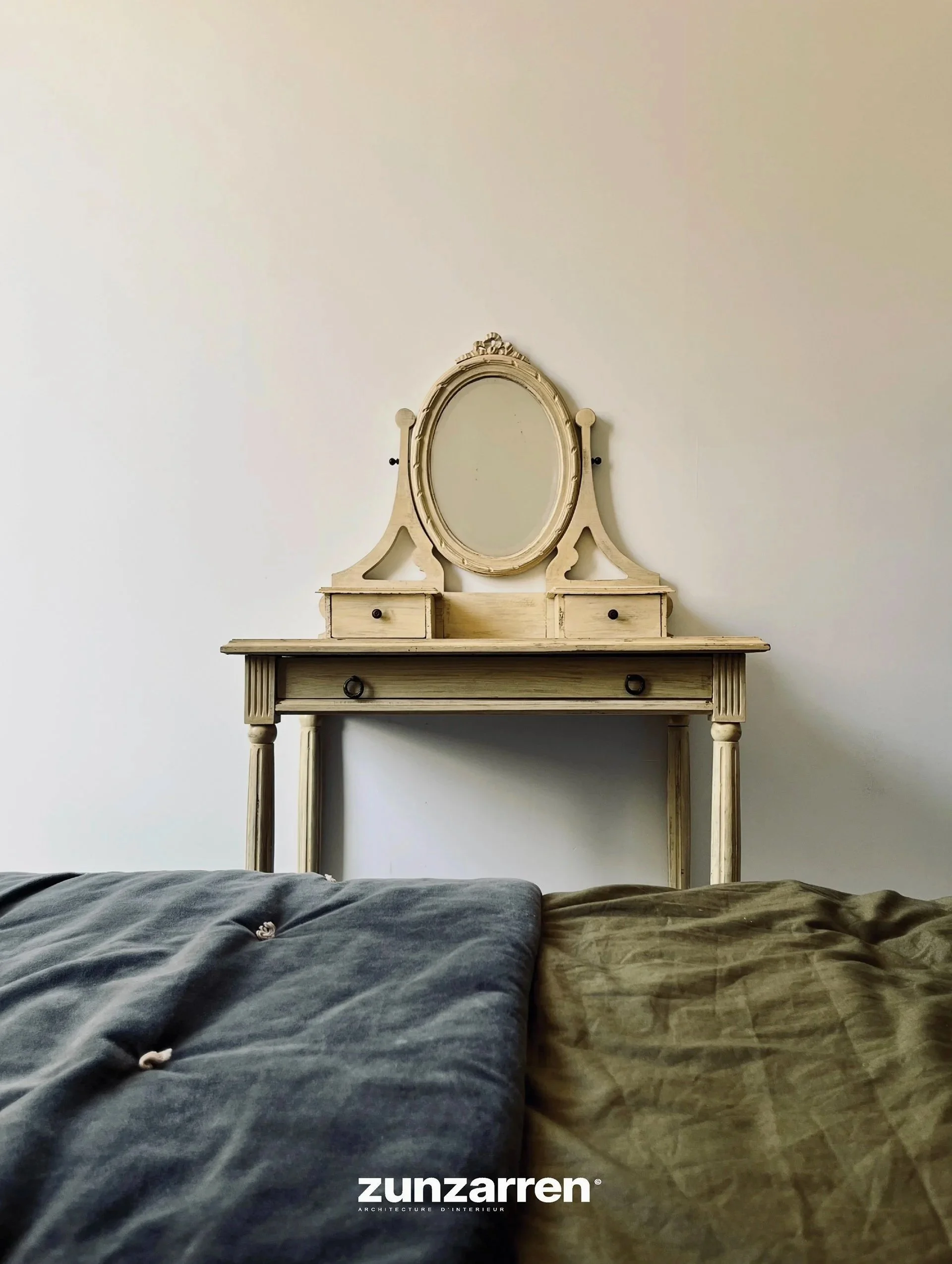 La maison se déploie sur deux niveaux : l’entrée se situe au rez-de-chaussée, tandis que l’espace nuit prend place au rez-de-jardin, offrant ainsi intimité et tranquillité. L’approche a visé à valoriser la lumière naturelle, optimiser les surfaces disponibles et inscrire la transformation dans un langage contemporain, tout en respectant l’identité de l’échoppe.