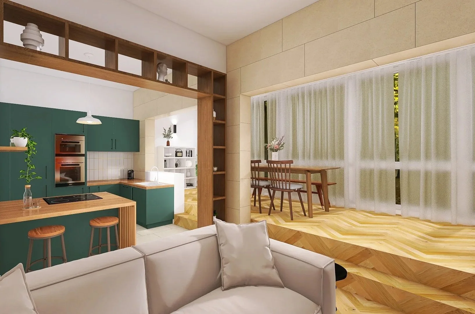 Le bâtiment, initialement dépourvu de cuisine et de salle de bain, nécessitait une refonte totale de l’agencement intérieur. L’intervention a consisté à repenser intégralement les volumes pour structurer un nouvel espace de vie, centré autour d’une cuisine fonctionnelle et chaleureuse. Véritable cœur du projet, cette pièce articule les circulations et organise les différents usages du quotidien.